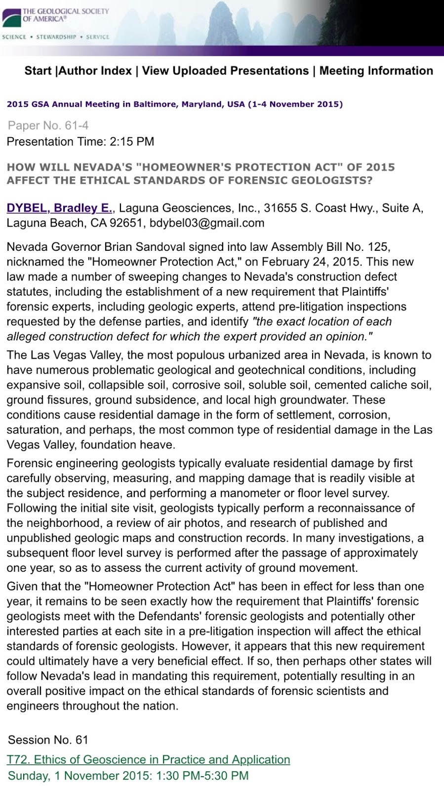 “How Will Nevada’s ‘Homeowner’s Protection Act’ of 2015 Affect the Ethical Standards of Forensic Geologists?” Paper No. 61-4, presented at the 2015 Annual Meeting of the Geological Society of America.