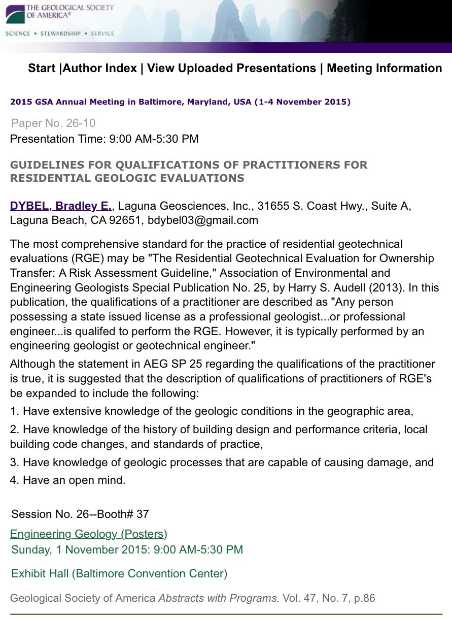 “Guidelines for Qualifications for Practitioners for Residential Geologic Evaluations,” Paper 26-10, presented at the 2015 Annual Meeting of the Geological Society of America.