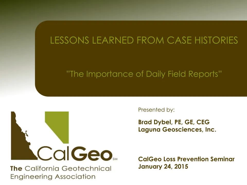 Lecture by Brad Dybel at the 2015 Loss Prevention Workshop by Cal Geo (the California Geotechnical Engineers Association.